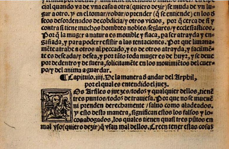 “Los Arfiles o juezes / todos y qualquier dellos, tienen tres puntos / todos de trauiesa. Porque no se mueue ni prenden derechamente / saluo como aladeados. Y ello desta manera, significan estos los locos y falsos abogados, los quales tienen quasi tres puntos en mal uso (quieo dezir) que usan mal dellos. Creen tener estas cosas clara noticia de la verdad, buena eloquencia / hermosa familiaridad y rica y abastada familia. De aquestas tres cosas siempre usan mal. Has de notar quando ya están ricos, de que manera alargan, polongan/ y abreuian los pleitos y plazos dellos, por sus blandas y hermosas palabras, y agradables y mañosas razones, fingiendo que quieren yr como descontentos de los juezes, por que no poroueen lo que quieren que se prouea. El canto de los tales semejante es al de las sirenas, las quales con su cantar atraen a peligro a los marineros. De los queles es dicho en un salmo: acecha para arrebatar o robar al pobre para tragarle. Pero no ay necesidad que el diablo los trayga alli, porque ellos corren, y faltando se dan priesa por yr presto con el.