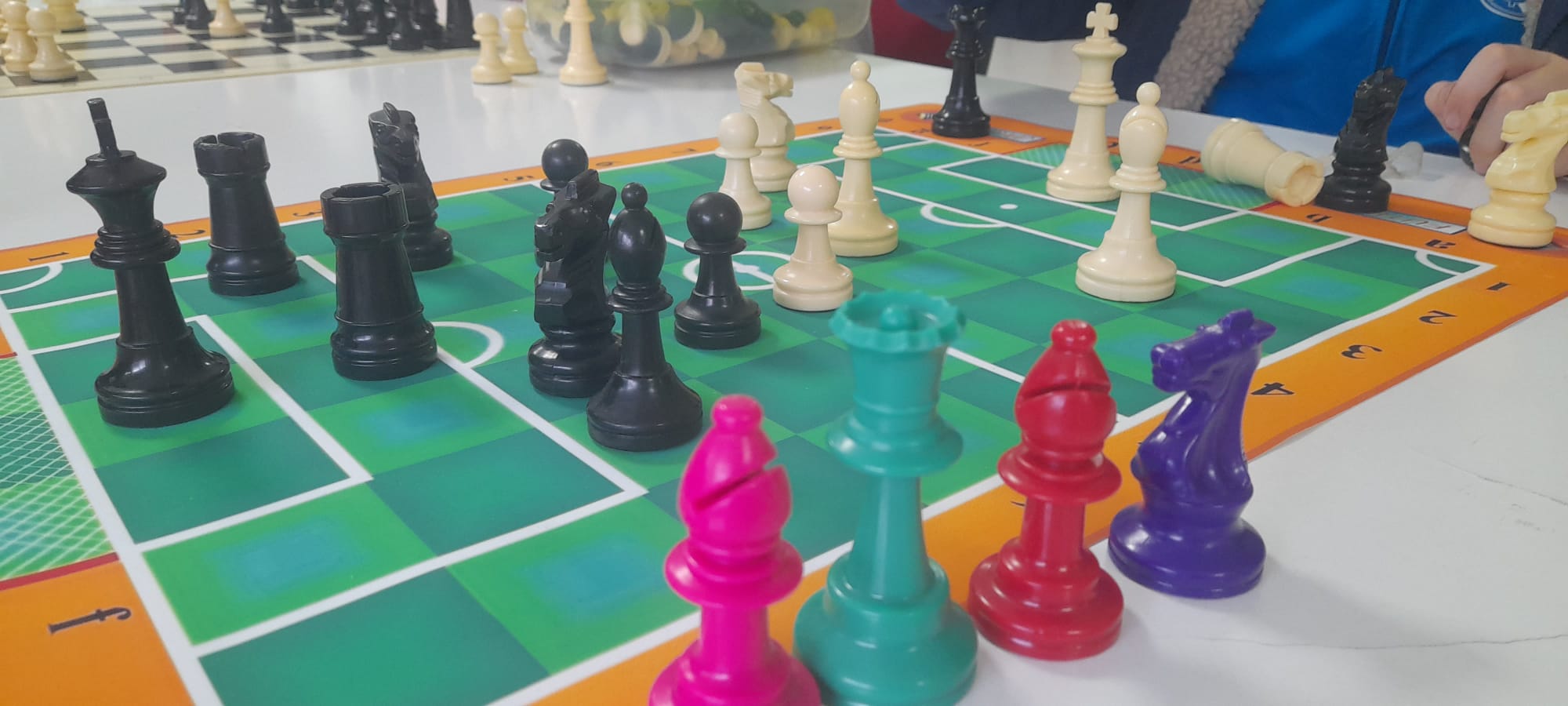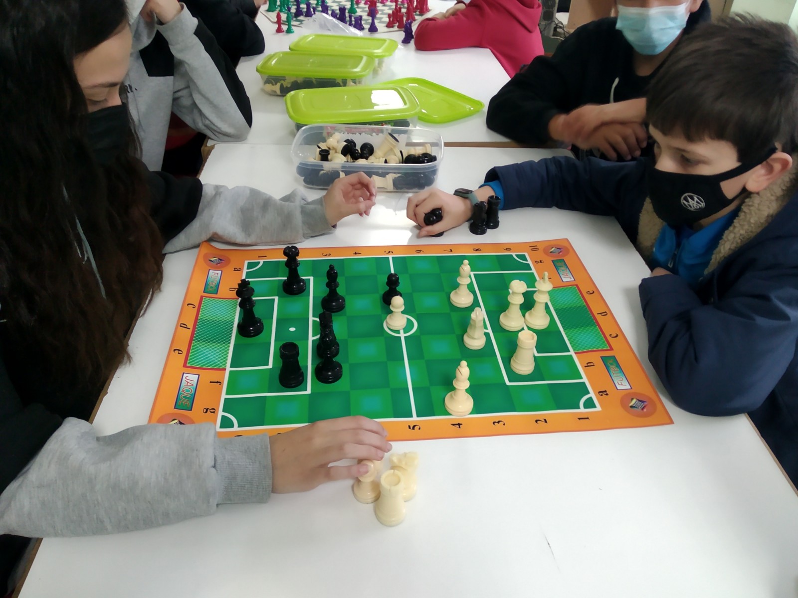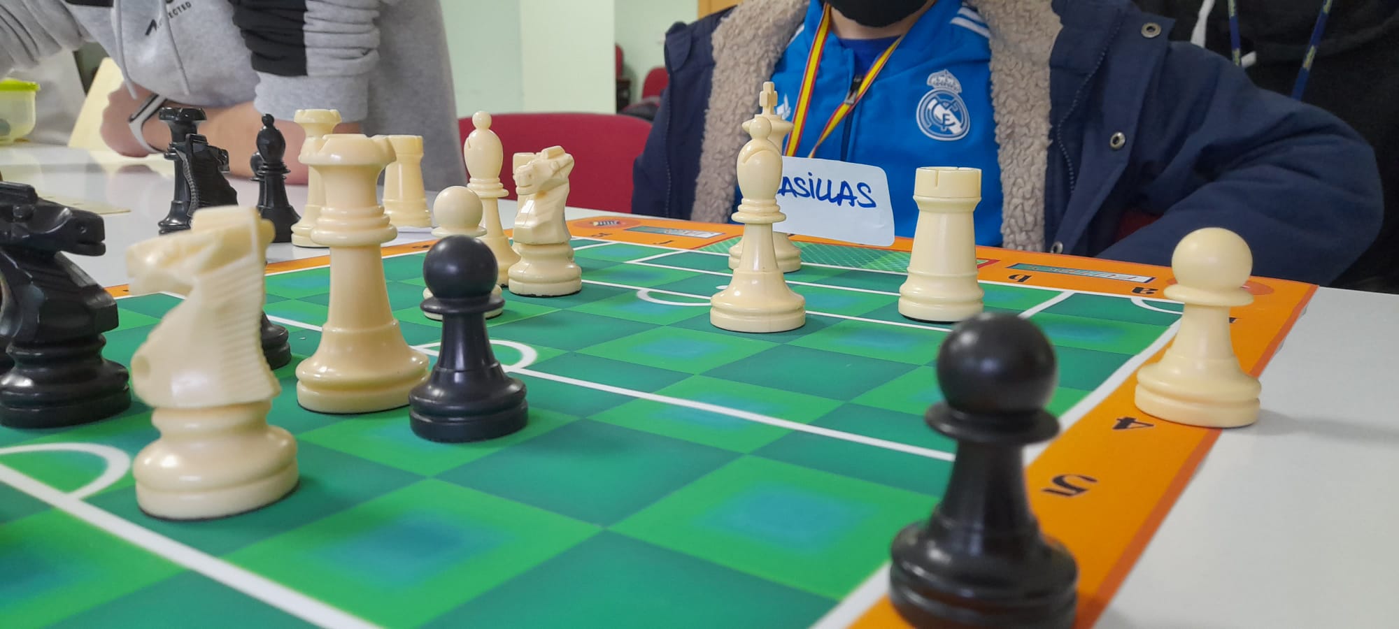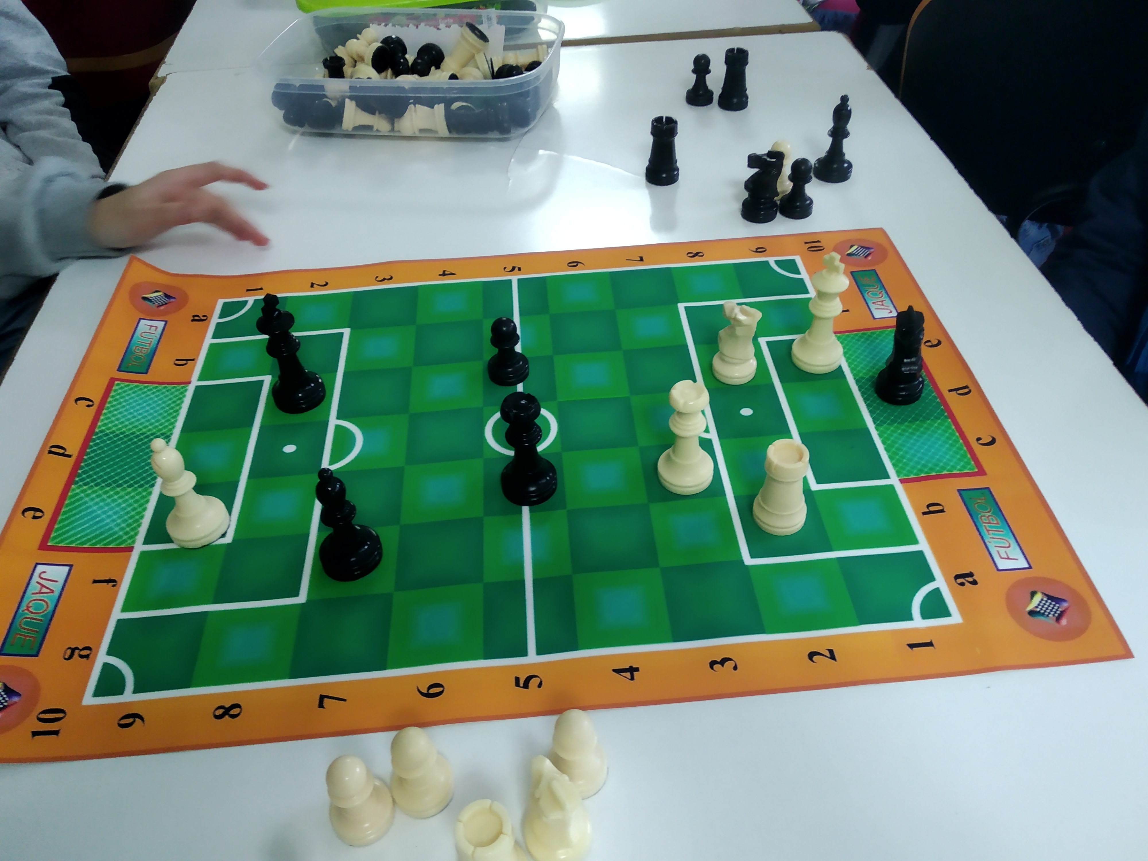 Amablemente nos los ha enviado para nuestros alumnos de la Escuela municipal de ajedrez de San Lorenzo de El Escorial. Así que hoy Alex y Carol han inaugurado la competición de futbol-jaque, donde hemos tenido hasta un espontáneo Maraja que ha saltado al campo en medio del partido. Después de un ataque fulgurante de los Alfiles de Alex a una jugada del gol, Carol ha contraatacado y conseguido el gol de oro, cuando su Caballo ha traspasado la línea de portería.