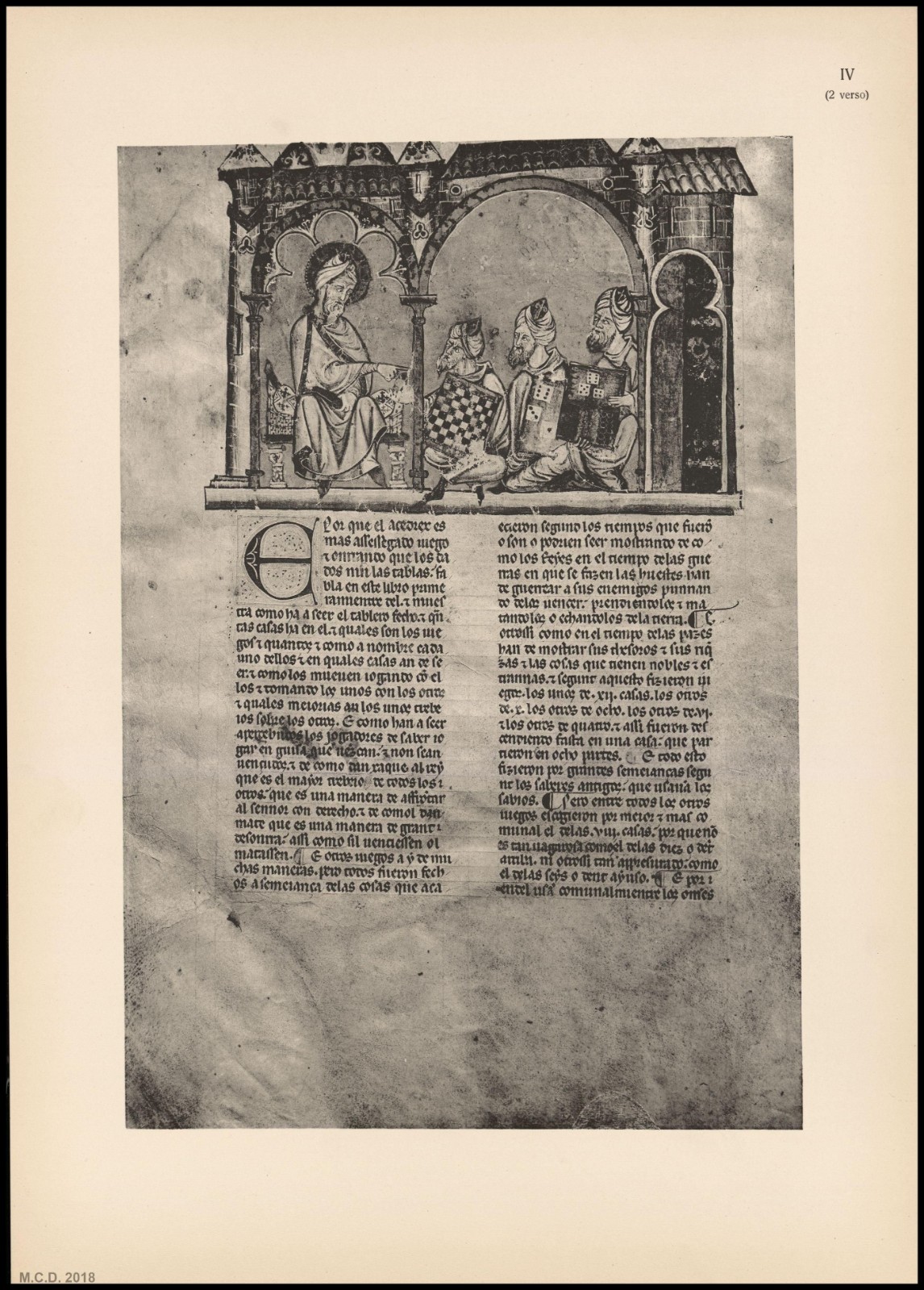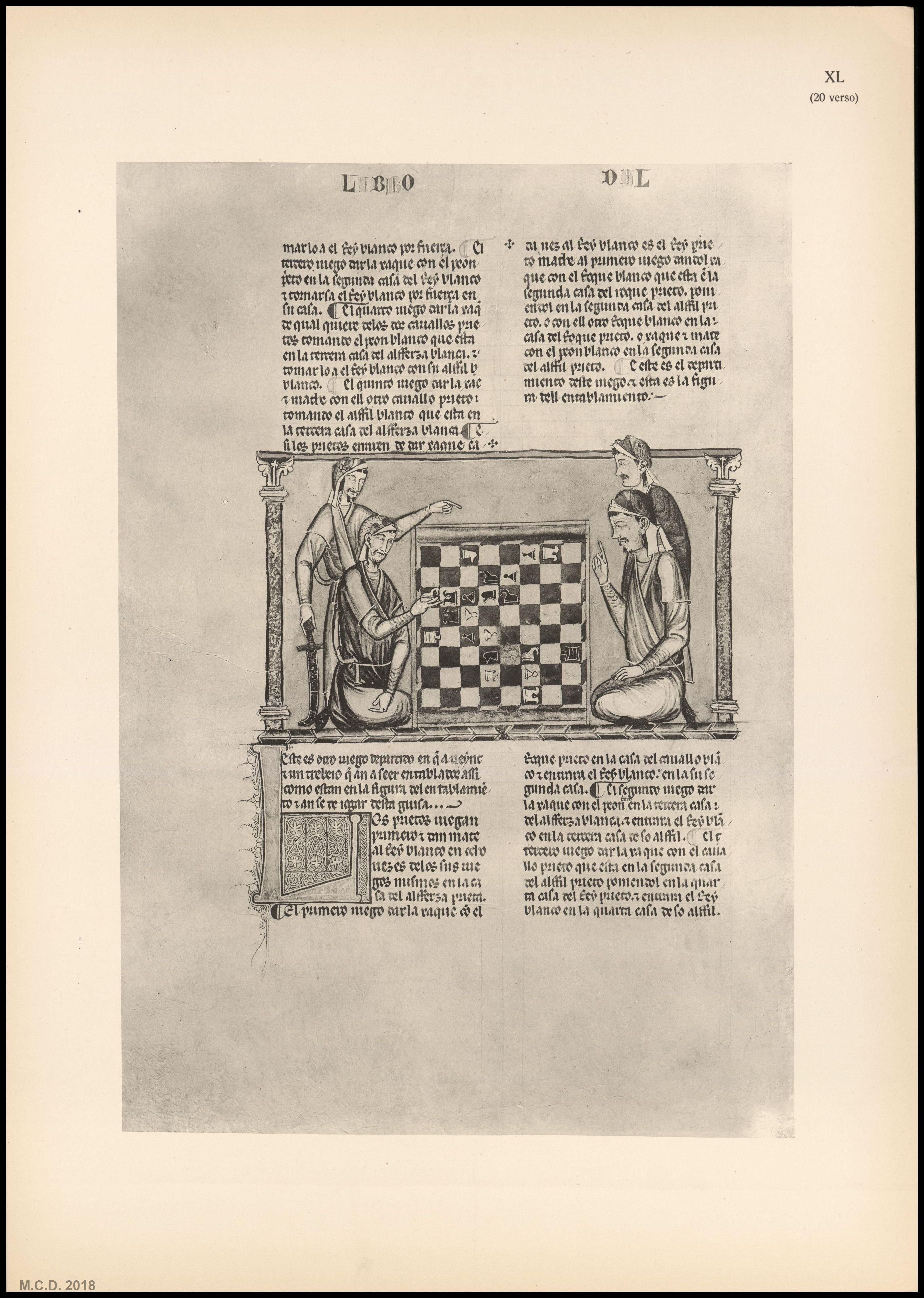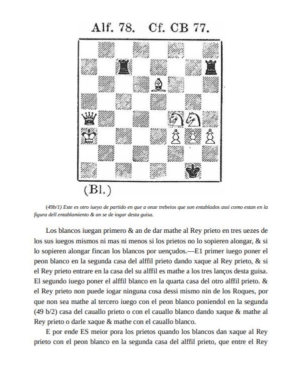 “Los 103 problemas de esta colección, de hermoso manuscrito, una de las gemas de la Biblioteca Escurial, fue ejecutado por Alfonso X, Rey de Castilla, a mediados del siglo XIII, y que probablemente es el primer trabajo europeo sobre el juego existente. Este espléndido manuscrito se describe en el catálogo de la biblioteca como: Juegos diversos de Axedrez, dados y tablas, con sus explicaciones, ordenados por mandado del Rey D. Alonso el Sabio”.