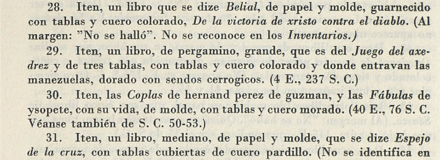 “Iten, un libro de pergamino, grande, que es del Juego de axedrez y de tres tablas, con tablas y cuero colorado, y donde entravan las manezuelas, dorado, con sendos cerrogicos”.