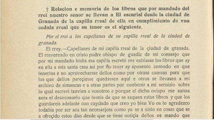 “Relación e memoria de los libros que por mandado del rrei nuestro senor se llevan a El escurial desde la ciudad de granada de la capilla rreal de ella en cumplimiento de vna cedula rreal que su tenor es el siguiente…”