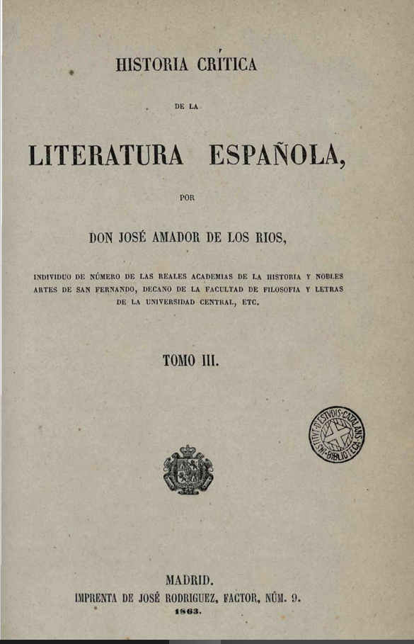1863 “Historia crítica de la Literatura Española” Amador de los Ríos Vol III. Biblioteca de Catalunya.