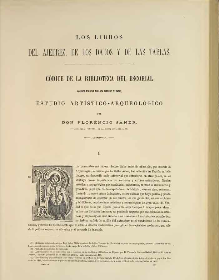 “La mayor parte de los que hasta ahora se han ocupado en el libro de don Alfonso el Sabio lo han hecho únicamente considerándolo bajo el aspecto artístico y con la posible economía. Así es que no se han copiado más que cuatro o seis miniaturas de las pequeñas y de los juegos de las tablas o dados, que son las menos, y sólo una que yo sepa de las del ajedrez, que son en mayor número y las más importantes, aquellas que ofrecen mayor interés tanto en el concepto histórico y arqueológico cuanto en la misma parte artística, presentando una variedad inmensa de trajes y otros objetos, como puede verse por la descripción que doy en el texto. Y esto aún por cuenta de un extranjero”.