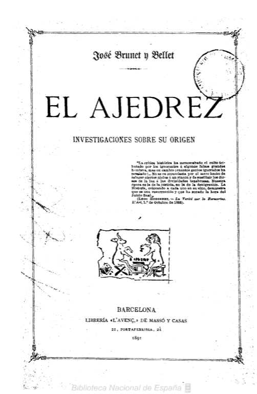1891 “Investigaciones sobre el origen del ajedrez” Josep Brunet i Bellet. Biblioteca Nacional de España.