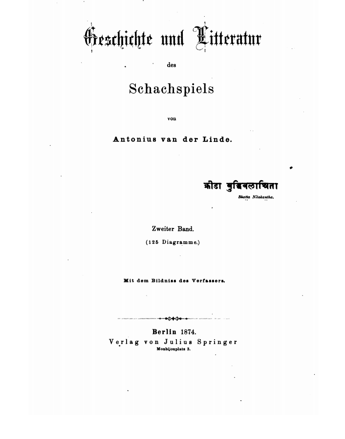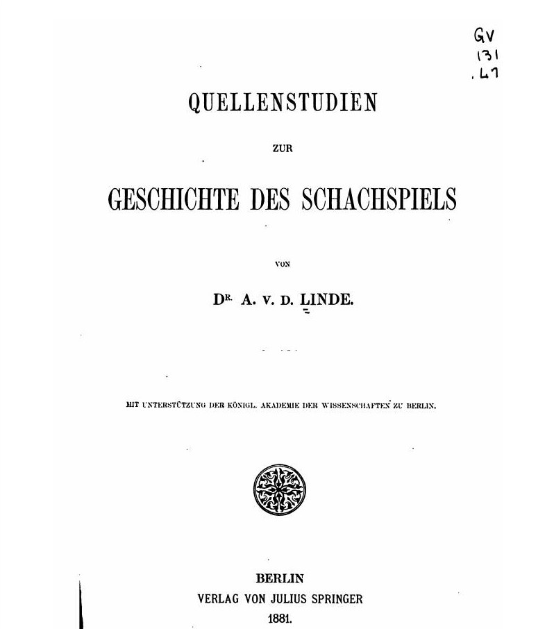 1874 “Geschichte des Schachpiels” Antonius Van der Linde. 1881 “Quellenstudien zur Geschichte” Antonius Van der Linde. Google Books