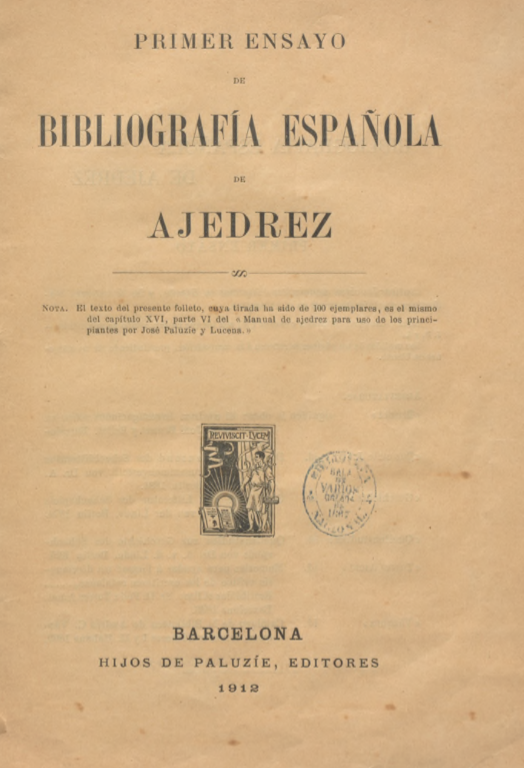 1912 “Primer ensayo de bibliografía española de ajedrez” José Paluzie y Lucena. Biblioteca Nacional de España