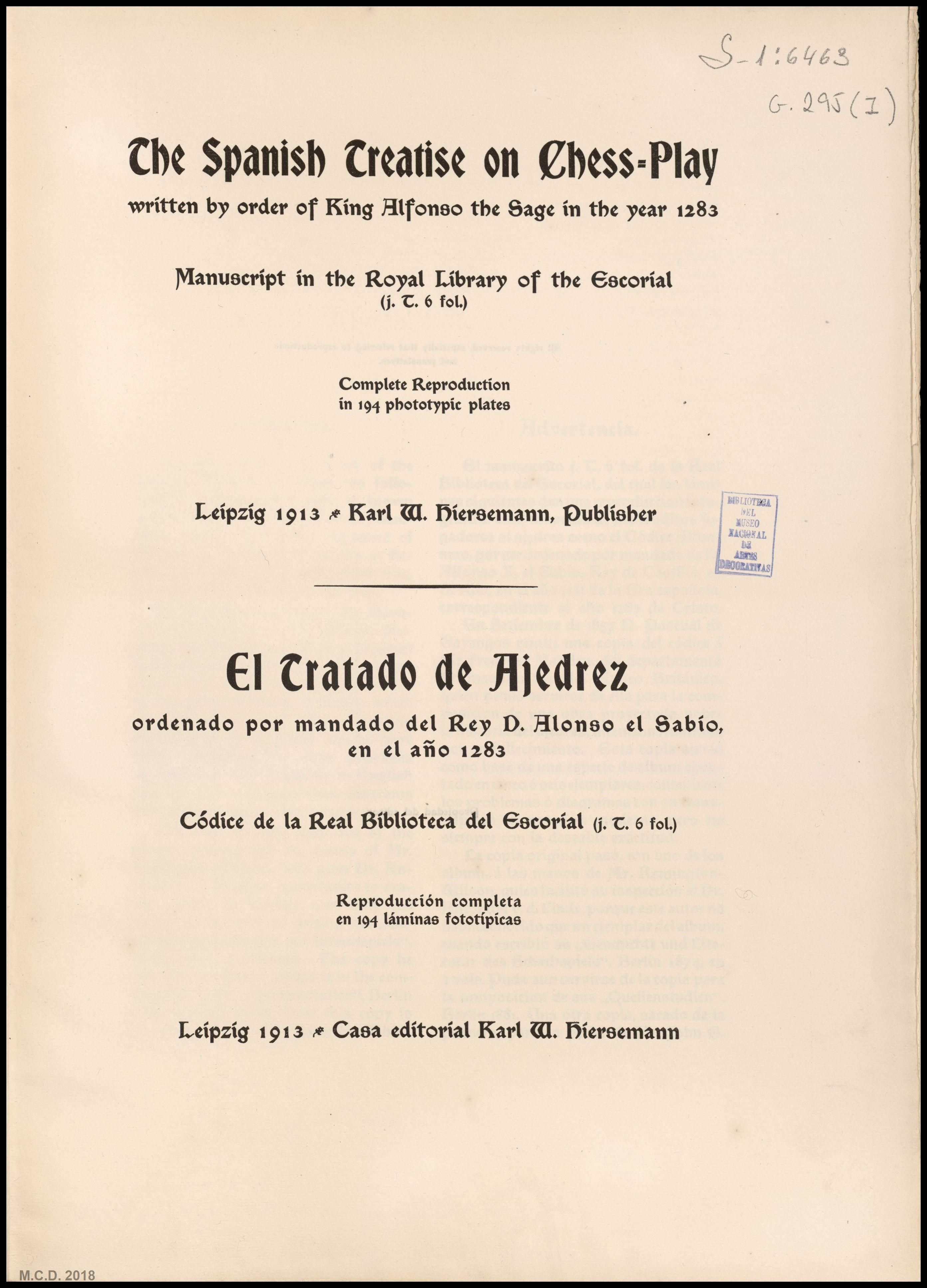 1913 “The Spanish teatrise on Chess play” Leipzig. Karl W. Hiersemann. Biblioteca virtual del Patrimonio Bibliográfico. Recursos pedagógicos