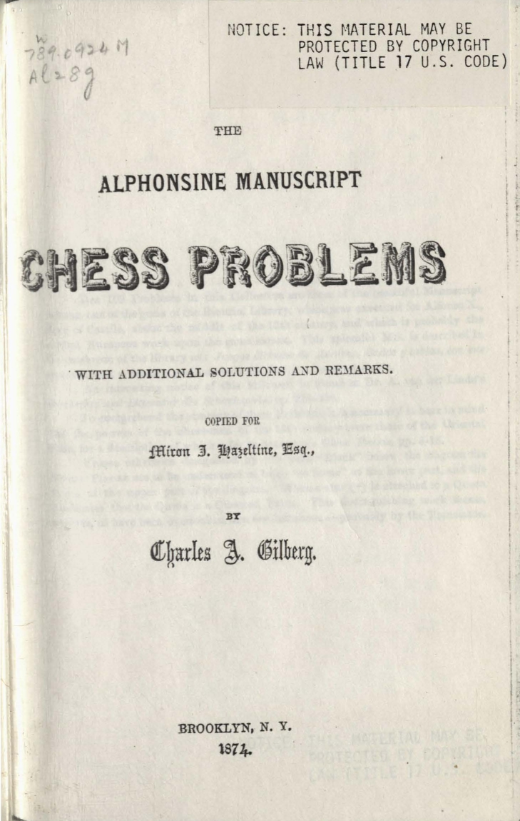 Ese mismo año, 1874, Charles A. Gilbert publica “The Alphonsine Manuscript: Chess Problems with Additional Solutions and Remarks”, una edición destinada a un único lector, Miron James Hazeltine. Desconozco el motivo de esta edición pero se supone un interés especial por este libro.