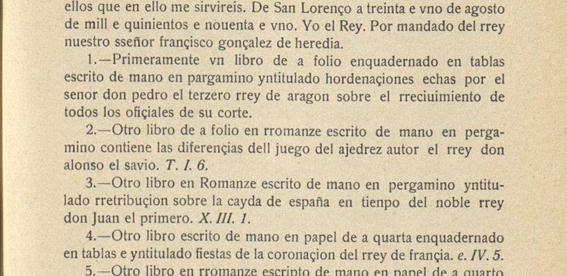 2.-Otro libro de a folio, en rromanze, escrito de mano, en pergamino, contiene las diferençias dell juego del ajedrez, autor el rrey don alonso el Savio. T.I.6.