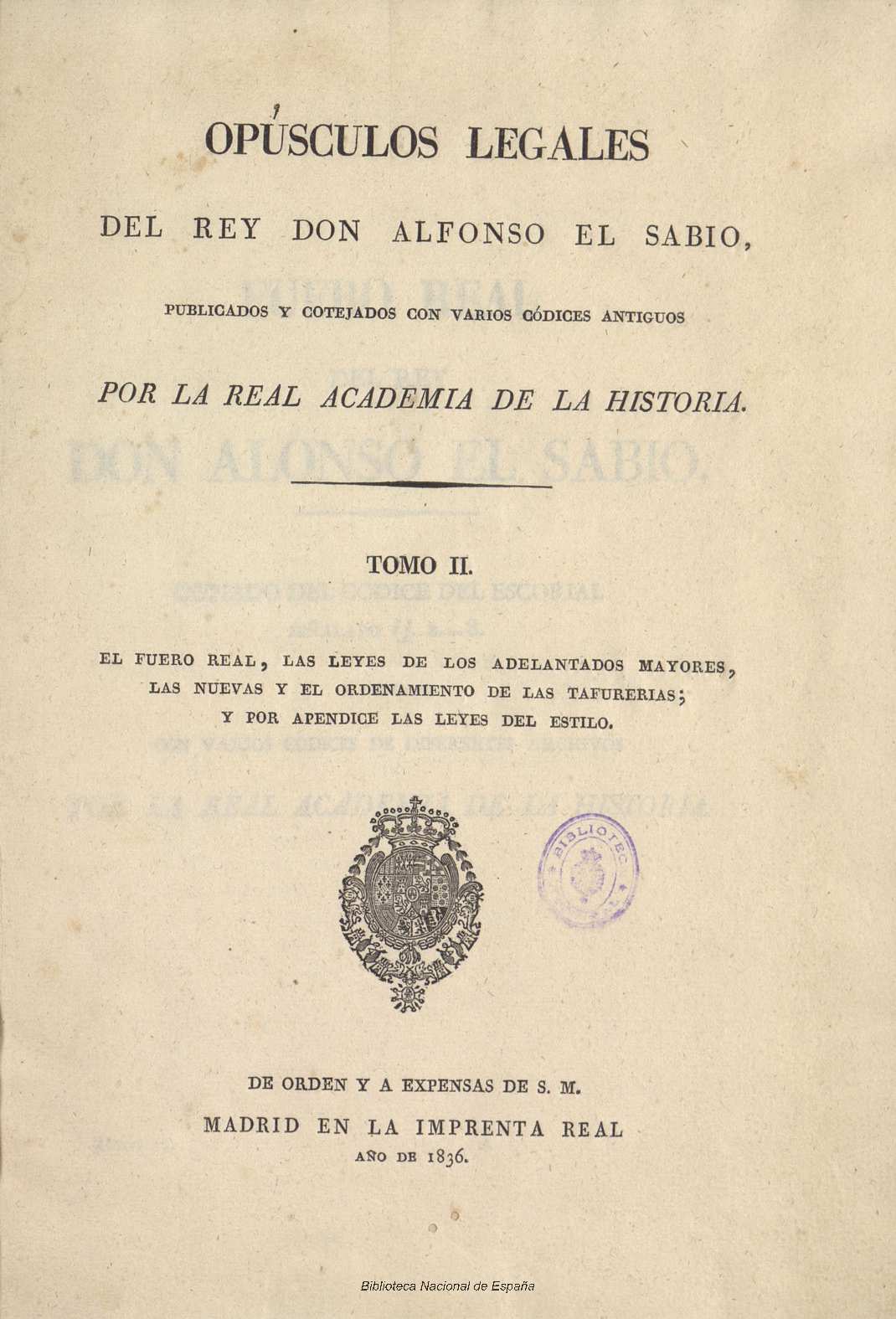 “Opúsculos legales del Rey Don Alfonso El Sabio”. Real Academia de la Historia. 1836. BNE. Biblioteca Digital Hispánica.