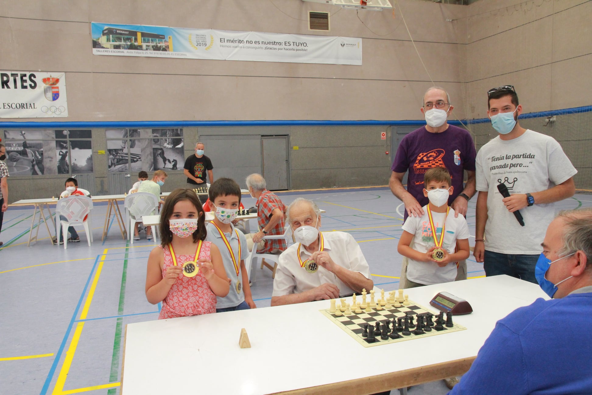 D. Manuel Álvarez Escudero, leyenda viva del ajedrez, que el próximo octubre cumple 100 años, participó como siempre en el XXXVIII Torneo de San Lorenzo de El Escorial (Madrid), celebrado el pasado 8 de agosto. La organización y los jugadores del Torneo le rendimos un merecido homenaje junto con los más pequeños, María, Hugo y Jairo, de categoría Sub 8. D. Manuel no sólo jugó sino que quedó clasificado en la 16º posición y fue vencedor en la categoría veteranos, que no es menor tratándose de este juego.