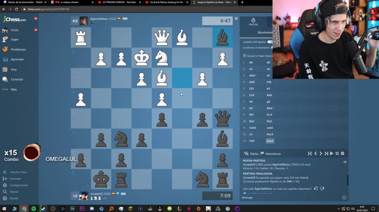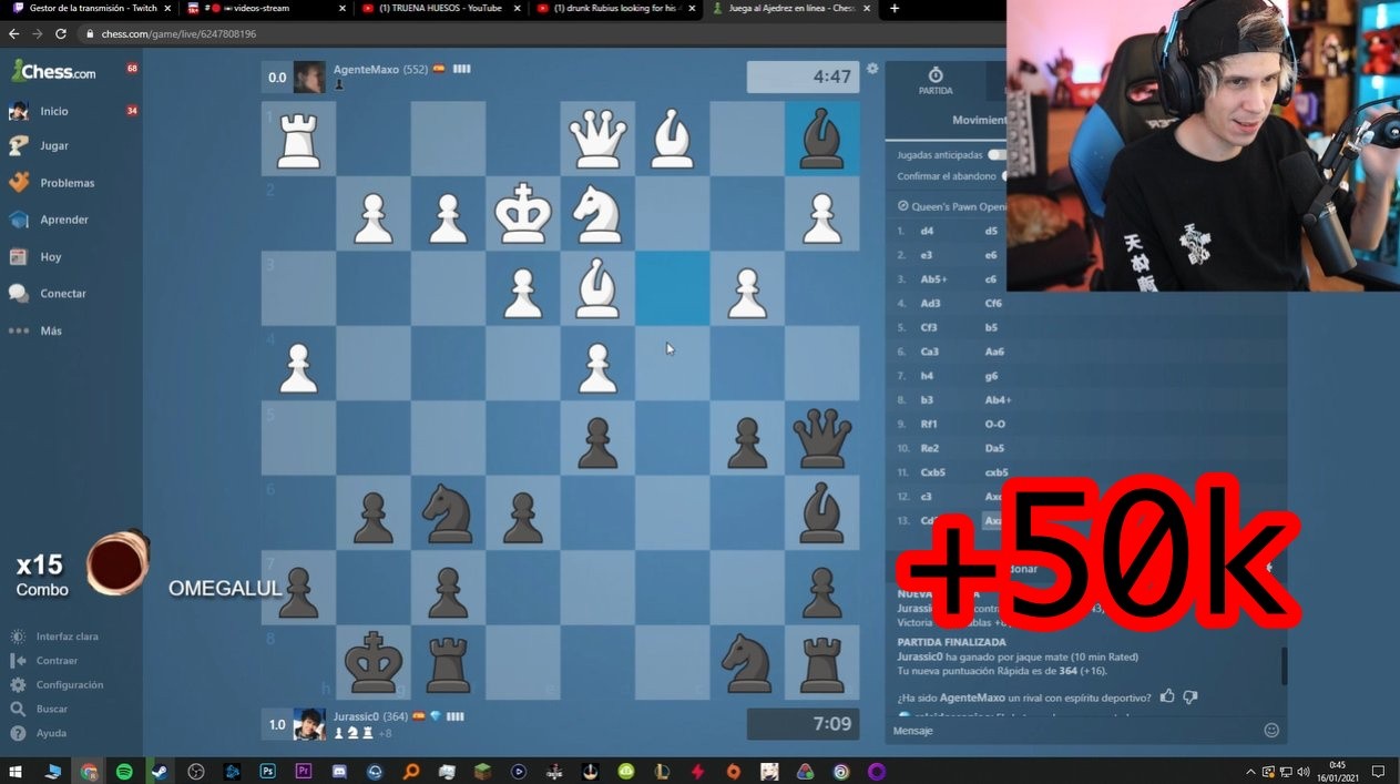 Rubén Doblas Gundersen, conocido en YouTube como "elrubiusOMG", ahora mismo el streamer con más suscriptores de España, estuvo jugando a nuestro maravilloso juego llamado ajedrez en un directo de Twitch. Rubius escogió el nick de Jurassic0. Este directo fue visto por más de 50.000 personas, una forma de atraer y visibilizar el ajedrez para los más pequeños. La estrella de Youtube comenta que le gusto la serie “Gambito de Dama” que tanto éxito a cosechado. El ajedrez en linea esta teniendo mucho éxito en las plataforma de Twitch (ver directos) con jugadores de la talla de Hikaru Nakamura, Alireza Firouzja que están retransmitiendo sus partidas/torneos en directos con un éxito aplastador.